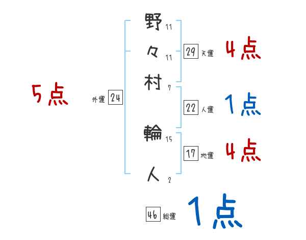 天運![]() | 野々村輪人さんの天運は29画の4つ星!完全主義で才能がある。厳格な心の持ち主。 家系が持つ宿命的な運勢を表します。祖先から受け継いだ苗字ですので自分の力が及びません。家柄を象徴します。 |