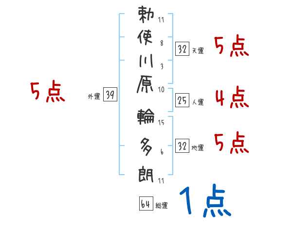 天運![]() | 勅使川原輪多朗さんの天運は32画の5つ星!柔軟性があり成功する。チャンスが多く金運が良い。 家系が持つ宿命的な運勢を表します。祖先から受け継いだ苗字ですので自分の力が及びません。家柄を象徴します。 |