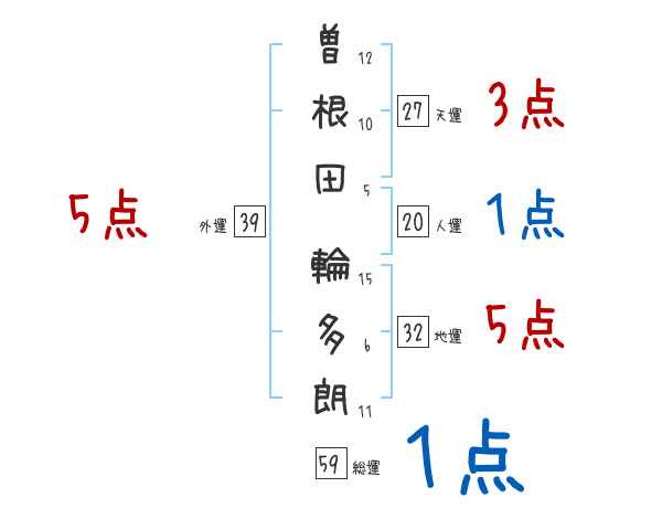地運![]() | 曽根田輪多朗さんの地運は32画の5つ星!柔軟性があり成功する。チャンスが多く金運が良い。 個性を表す基礎的な運勢です。性格形成や対人関係、行動力など家庭環境に影響されます。主に誕生してから20歳くらいまでの若年期の運勢を表します。 |