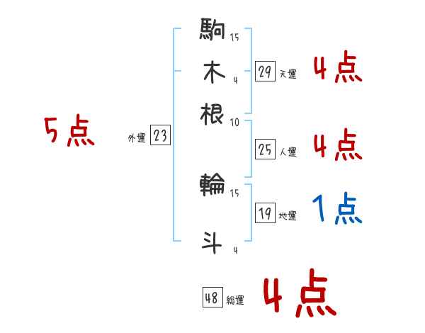 外運![]() | 駒木根輪斗さんの外運は23画の5つ星!想像力に優れ活力がある。一代で成功し名誉を手に入れる。 生活面を象徴する運勢です。外部から受ける影響力を表し、結婚運、家庭運や職場、環境への順応性を表します。 |