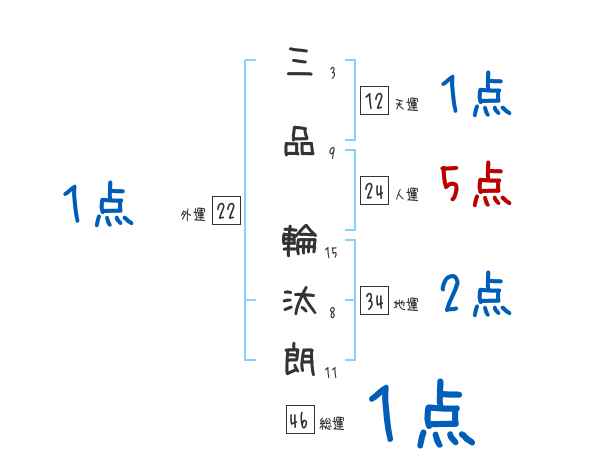 外運![]() | 三品輪汰朗さんの外運は22画の1つ星!努力することが苦手ないっぽう手先が器用。芸術性にも優れる。 生活面を象徴する運勢です。外部から受ける影響力を表し、結婚運、家庭運や職場、環境への順応性を表します。 |
