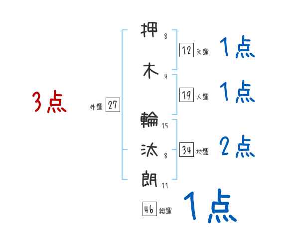 外運![]() | 押木輪汰朗さんの外運は27画の3つ星!頭脳明晰だが強情で摩擦が多い傾向。孤立に注意。 生活面を象徴する運勢です。外部から受ける影響力を表し、結婚運、家庭運や職場、環境への順応性を表します。 |