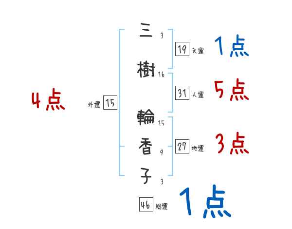 総運![]() | 三樹輪香子さんの総運は46画の1つ星!迷走することが多く苦労するかも。目先のことにとらわれないように。 あなたの人生を表す1番重要な運勢です。生涯を通じて影響する総合運となり、主に50歳以降の晩年期に影響を及ぼします。 |