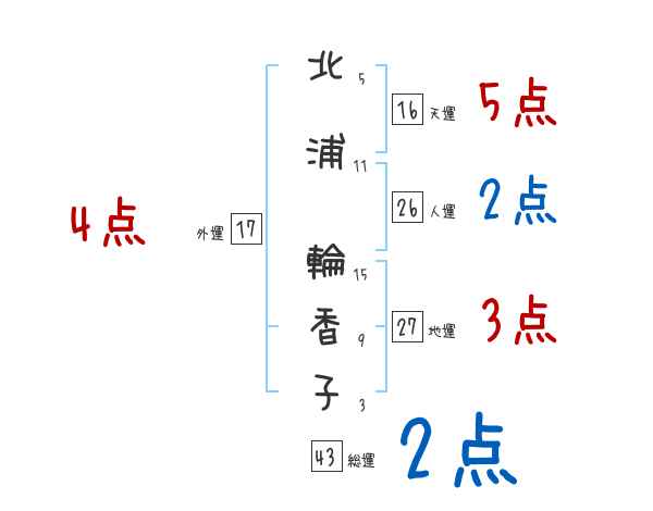 外運![]() | 北浦輪香子さんの外運は17画の4つ星!積極的な行動力。地位を気づき財産を手に入れる。純粋な心と直感力。 生活面を象徴する運勢です。外部から受ける影響力を表し、結婚運、家庭運や職場、環境への順応性を表します。 |