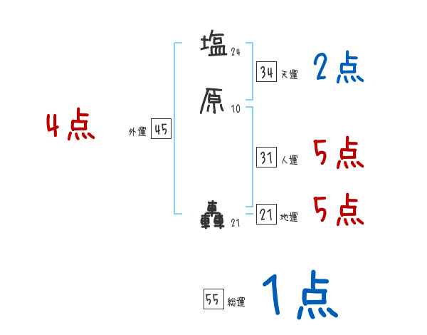 外運![]() | 塩原轟さんの外運は45画の4つ星!もくもくと物事を進め達成する。地味な努力家。 生活面を象徴する運勢です。外部から受ける影響力を表し、結婚運、家庭運や職場、環境への順応性を表します。 |