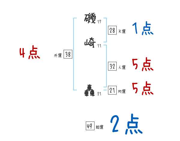 人運![]() | 磯崎轟さんの人運は32画の5つ星!柔軟性があり成功する。チャンスが多く金運が良い。 性格や才能などを表す2番目に重要な運勢です。人間関係や協調性、社会的な成功に影響します。主に20歳から50歳ぐらいまでの中年期の運勢を表します。 |
