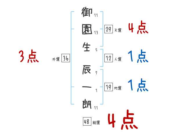 天運![]() | 御園生辰一朗さんの天運は29画の4つ星!完全主義で才能がある。厳格な心の持ち主。 家系が持つ宿命的な運勢を表します。祖先から受け継いだ苗字ですので自分の力が及びません。家柄を象徴します。 |