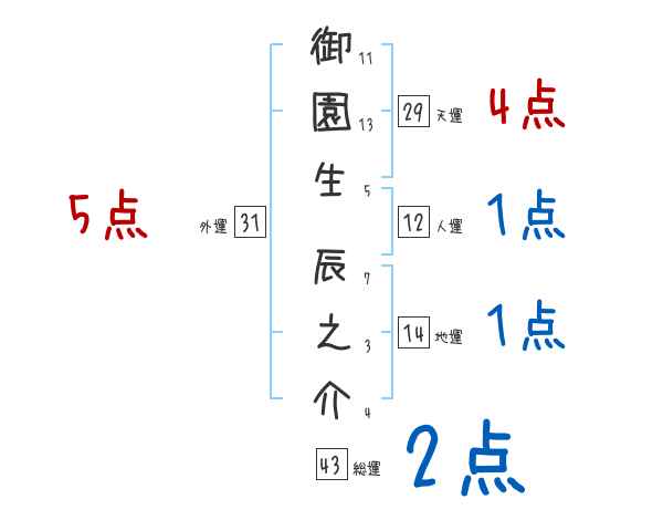 総運![]() | 御園生辰之介さんの総運は43画の2つ星!頑固な性格で独立心が強いかも。やや非現実的で浪費に注意しましょう。 あなたの人生を表す1番重要な運勢です。生涯を通じて影響する総合運となり、主に50歳以降の晩年期に影響を及ぼします。 |