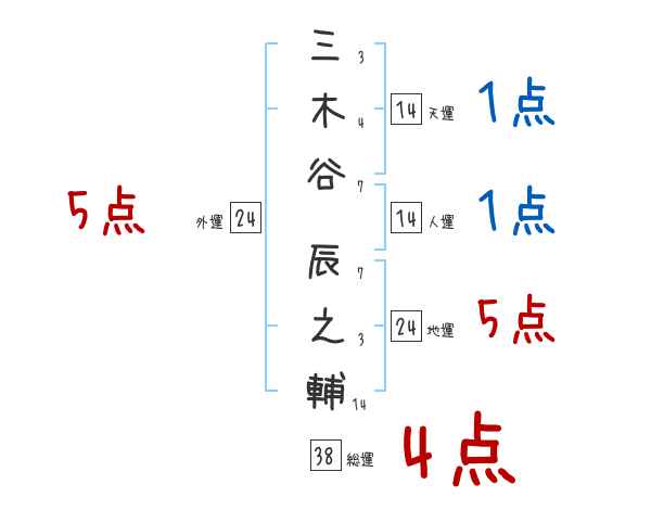 天運![]() | 三木谷辰之輔さんの天運は14画の1つ星!人に対して優しいがストレスを溜め込みがち。人間関係のトラブルを避けるよう気をつけましょう。 家系が持つ宿命的な運勢を表します。祖先から受け継いだ苗字ですので自分の力が及びません。家柄を象徴します。 |