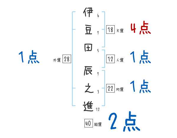 天運![]() | 伊豆田辰之進さんの天運は18画の4つ星!情熱的で剛気。忍耐力があり信頼される。 家系が持つ宿命的な運勢を表します。祖先から受け継いだ苗字ですので自分の力が及びません。家柄を象徴します。 |