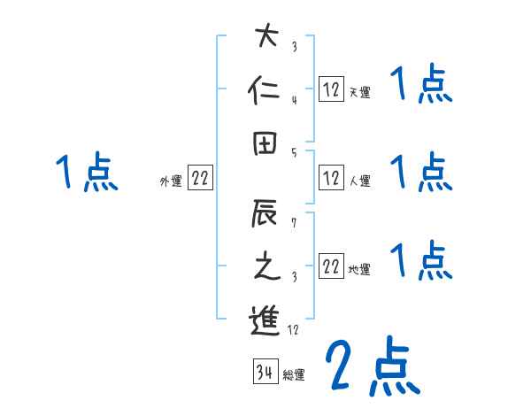 総運![]() | 大仁田辰之進さんの総運は34画の2つ星!独創性に優れるが、自尊心が強く災難に注意しましょう。 あなたの人生を表す1番重要な運勢です。生涯を通じて影響する総合運となり、主に50歳以降の晩年期に影響を及ぼします。 |