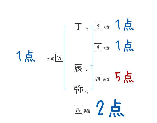 総運![]() | 丁辰弥さんの総運は26画の2つ星!波瀾万丈かも。信頼できる人を大事にしましょう。 あなたの人生を表す1番重要な運勢です。生涯を通じて影響する総合運となり、主に50歳以降の晩年期に影響を及ぼします。 |