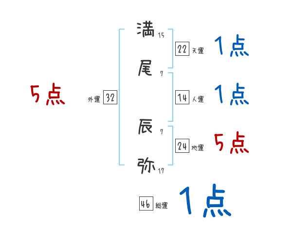 外運![]() | 満尾辰弥さんの外運は32画の5つ星!柔軟性があり成功する。チャンスが多く金運が良い。 生活面を象徴する運勢です。外部から受ける影響力を表し、結婚運、家庭運や職場、環境への順応性を表します。 |