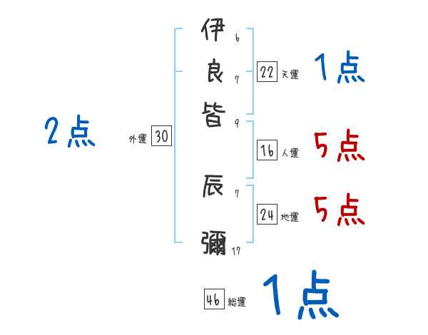人運![]() | 伊良皆辰彌さんの人運は16画の5つ星!人望が厚く大きく発展する。逆転成功が見える。 性格や才能などを表す2番目に重要な運勢です。人間関係や協調性、社会的な成功に影響します。主に20歳から50歳ぐらいまでの中年期の運勢を表します。 |