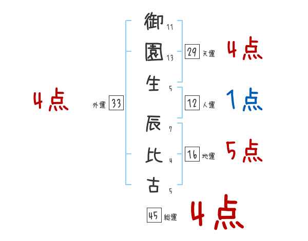 総運![]() | 御園生辰比古さんの総運は45画の4つ星!もくもくと物事を進め達成する。地味な努力家。 あなたの人生を表す1番重要な運勢です。生涯を通じて影響する総合運となり、主に50歳以降の晩年期に影響を及ぼします。 |