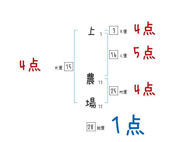 天運![]() | 上農場さんの天運は3画の4つ星!活動的で才能に恵まれ、多くの信頼を得る。希望に満ち成長する。 家系が持つ宿命的な運勢を表します。祖先から受け継いだ苗字ですので自分の力が及びません。家柄を象徴します。 |