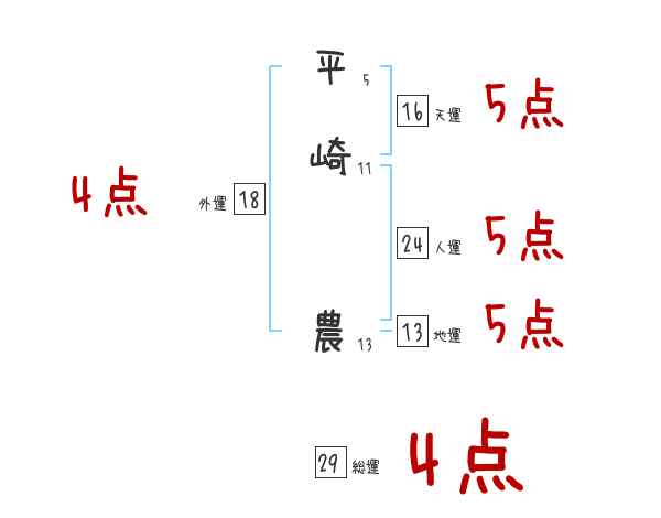 総運![]() | 平崎農さんの総運は29画の4つ星!完全主義で才能がある。厳格な心の持ち主。 あなたの人生を表す1番重要な運勢です。生涯を通じて影響する総合運となり、主に50歳以降の晩年期に影響を及ぼします。 |