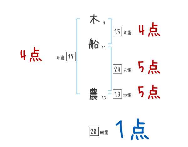 総運![]() | 木船農さんの総運は28画の1つ星!家庭環境に注意。スポーツで活躍できる能力があるかも。 あなたの人生を表す1番重要な運勢です。生涯を通じて影響する総合運となり、主に50歳以降の晩年期に影響を及ぼします。 |