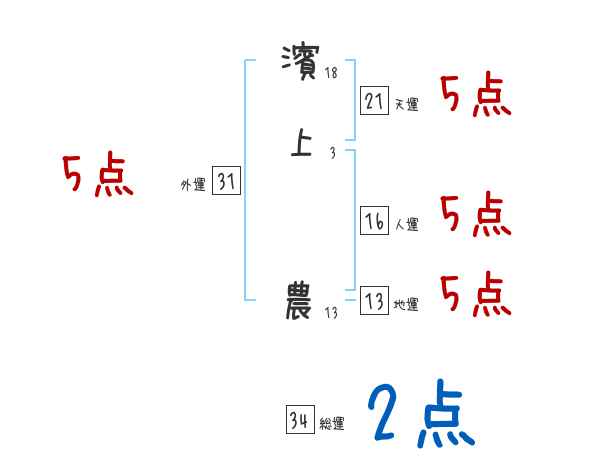 総運![]() | 濱上農さんの総運は34画の2つ星!独創性に優れるが、自尊心が強く災難に注意しましょう。 あなたの人生を表す1番重要な運勢です。生涯を通じて影響する総合運となり、主に50歳以降の晩年期に影響を及ぼします。 |