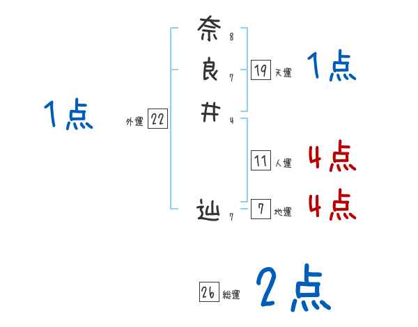 天運![]() | 奈良井辿さんの天運は19画の1つ星!優れた才能を持ちますが、協調性が足りないことも。周りの人と協力する事を意識しましょう。 家系が持つ宿命的な運勢を表します。祖先から受け継いだ苗字ですので自分の力が及びません。家柄を象徴します。 |