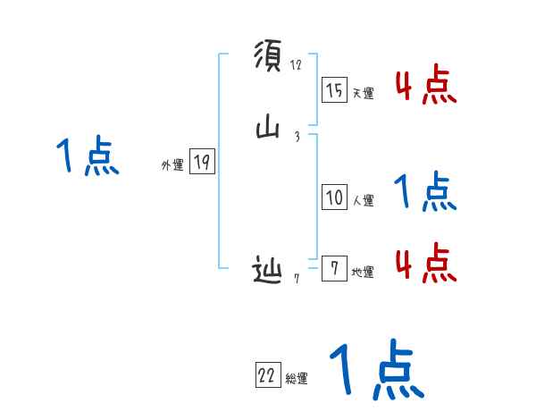 外運![]() | 須山辿さんの外運は19画の1つ星!優れた才能を持ちますが、協調性が足りないことも。周りの人と協力する事を意識しましょう。 生活面を象徴する運勢です。外部から受ける影響力を表し、結婚運、家庭運や職場、環境への順応性を表します。 |