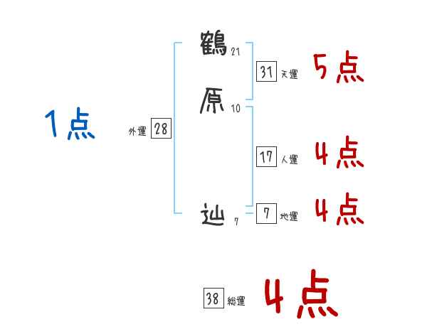 天運![]() | 鶴原辿さんの天運は31画の5つ星!社交性があり判断力に優れる。順風満帆な人生で円満な生活。 家系が持つ宿命的な運勢を表します。祖先から受け継いだ苗字ですので自分の力が及びません。家柄を象徴します。 |