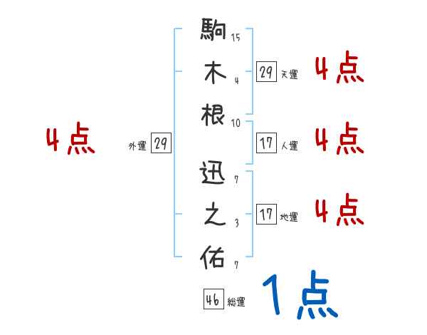 天運![]() | 駒木根迅之佑さんの天運は29画の4つ星!完全主義で才能がある。厳格な心の持ち主。 家系が持つ宿命的な運勢を表します。祖先から受け継いだ苗字ですので自分の力が及びません。家柄を象徴します。 |