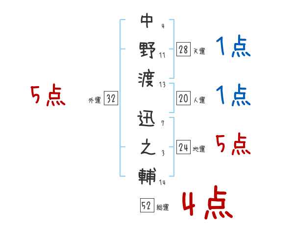 外運![]() | 中野渡迅之輔さんの外運は32画の5つ星!柔軟性があり成功する。チャンスが多く金運が良い。 生活面を象徴する運勢です。外部から受ける影響力を表し、結婚運、家庭運や職場、環境への順応性を表します。 |