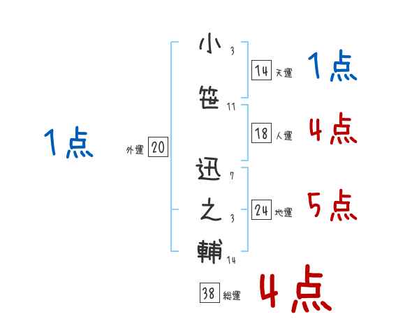 天運![]() | 小笹迅之輔さんの天運は14画の1つ星!人に対して優しいがストレスを溜め込みがち。人間関係のトラブルを避けるよう気をつけましょう。 家系が持つ宿命的な運勢を表します。祖先から受け継いだ苗字ですので自分の力が及びません。家柄を象徴します。 |
