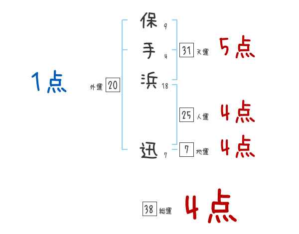 天運![]() | 保手浜迅さんの天運は31画の5つ星!社交性があり判断力に優れる。順風満帆な人生で円満な生活。 家系が持つ宿命的な運勢を表します。祖先から受け継いだ苗字ですので自分の力が及びません。家柄を象徴します。 |