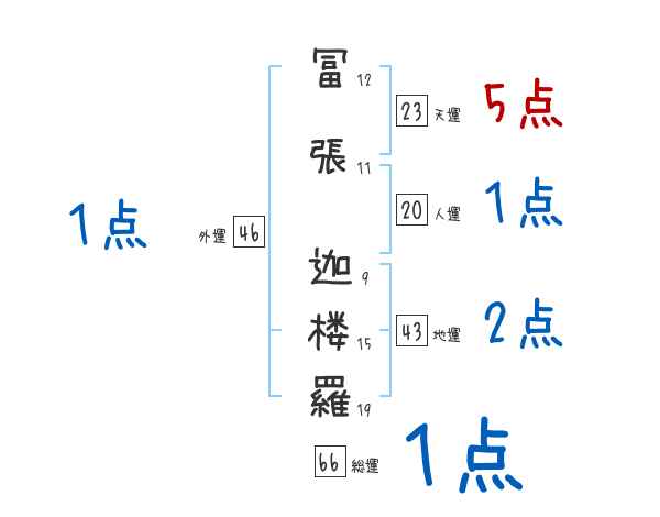 天運![]() | 冨張迦楼羅さんの天運は23画の5つ星!想像力に優れ活力がある。一代で成功し名誉を手に入れる。 家系が持つ宿命的な運勢を表します。祖先から受け継いだ苗字ですので自分の力が及びません。家柄を象徴します。 |