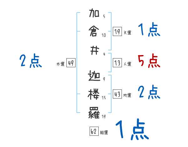 人運![]() | 加倉井迦楼羅さんの人運は13画の5つ星!才能に恵まれ人気がある。名声を手に入れる。円満な人生。 性格や才能などを表す2番目に重要な運勢です。人間関係や協調性、社会的な成功に影響します。主に20歳から50歳ぐらいまでの中年期の運勢を表します。 |