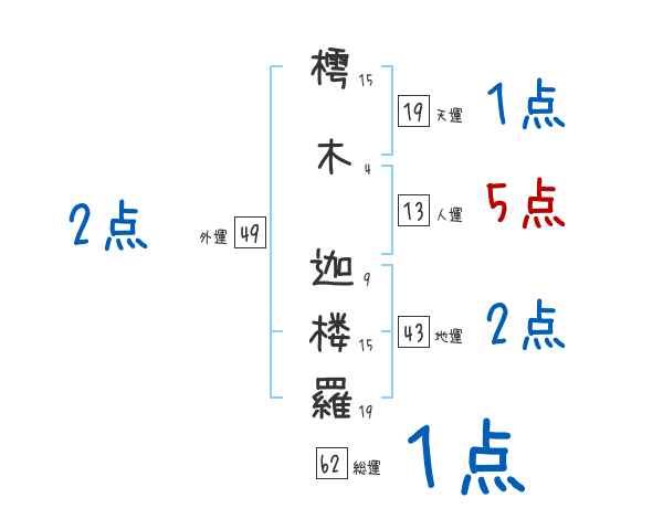 総運![]() | 樗木迦楼羅さんの総運は62画の1つ星!困難なトラブルが多く精神的に疲労しないように気をつけましょう。 あなたの人生を表す1番重要な運勢です。生涯を通じて影響する総合運となり、主に50歳以降の晩年期に影響を及ぼします。 |
