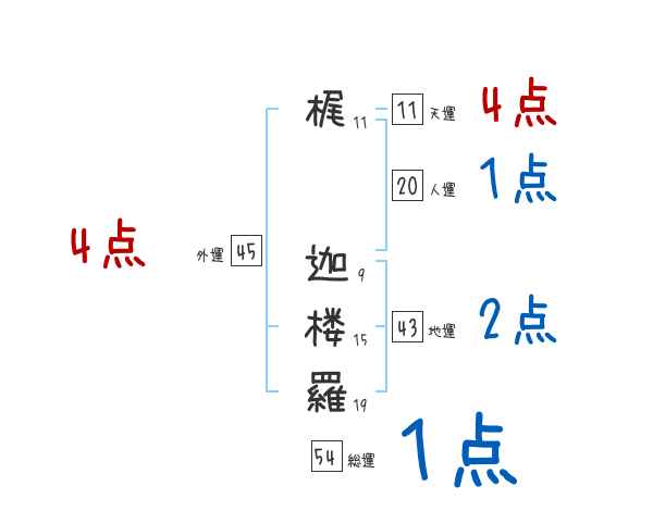 天運![]() | 梶迦楼羅さんの天運は11画の4つ星!着実に富や地位を得る幸運な人生。 家系が持つ宿命的な運勢を表します。祖先から受け継いだ苗字ですので自分の力が及びません。家柄を象徴します。 |