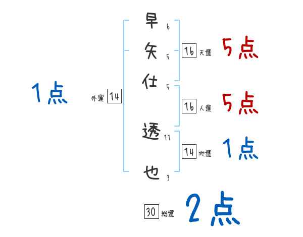 外運![]() | 早矢仕透也さんの外運は14画の1つ星!人に対して優しいがストレスを溜め込みがち。人間関係のトラブルを避けるよう気をつけましょう。 生活面を象徴する運勢です。外部から受ける影響力を表し、結婚運、家庭運や職場、環境への順応性を表します。 |
