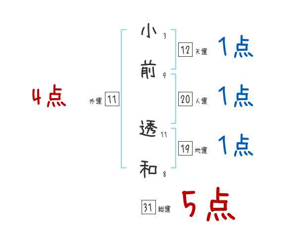 天運![]() | 小前透和さんの天運は12画の1つ星!簡単な失敗で諦めてしまいやすいかも。着実に行動すると良いでしょう。 家系が持つ宿命的な運勢を表します。祖先から受け継いだ苗字ですので自分の力が及びません。家柄を象徴します。 |