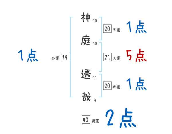 天運![]() | 神庭透哉さんの天運は20画の1つ星!社交が苦手。人とは違った才能があり波乱万丈な人生かも。 家系が持つ宿命的な運勢を表します。祖先から受け継いだ苗字ですので自分の力が及びません。家柄を象徴します。 |