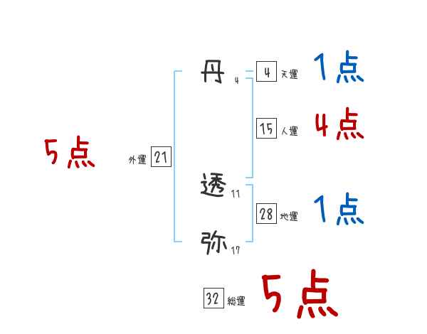 天運![]() | 丹透弥さんの天運は4画の1つ星!感情が不安定で苦労するかも。周囲との協調を心掛けましょう。 家系が持つ宿命的な運勢を表します。祖先から受け継いだ苗字ですので自分の力が及びません。家柄を象徴します。 |
