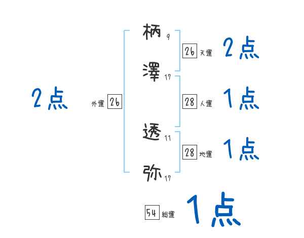 天運![]() | 柄澤透弥さんの天運は26画の2つ星!波瀾万丈かも。信頼できる人を大事にしましょう。 家系が持つ宿命的な運勢を表します。祖先から受け継いだ苗字ですので自分の力が及びません。家柄を象徴します。 |