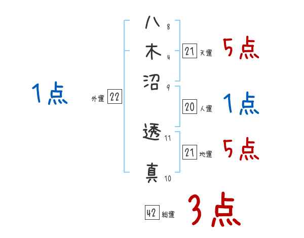 天運![]() | 八木沼透真さんの天運は21画の5つ星!統率力がある。独立し成功する。名誉を手に入れる。 家系が持つ宿命的な運勢を表します。祖先から受け継いだ苗字ですので自分の力が及びません。家柄を象徴します。 |