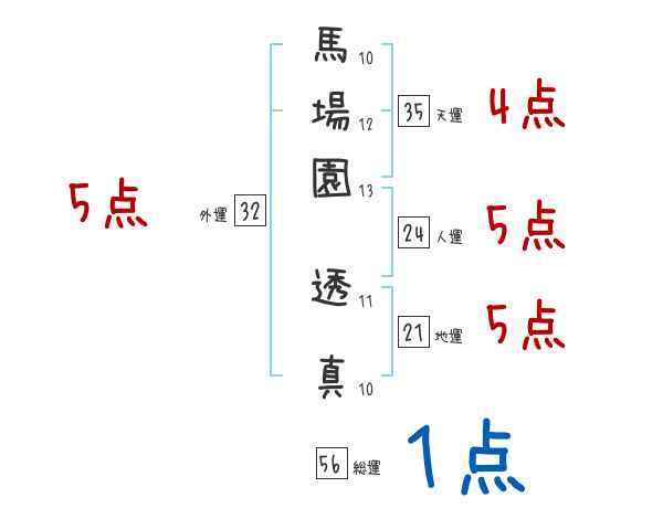 外運![]() | 馬場園透真さんの外運は32画の5つ星!柔軟性があり成功する。チャンスが多く金運が良い。 生活面を象徴する運勢です。外部から受ける影響力を表し、結婚運、家庭運や職場、環境への順応性を表します。 |