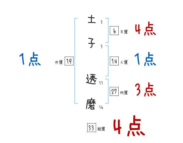 天運![]() | 土子透磨さんの天運は6画の4つ星!慎重な努力家で信頼を得る。誠実な精神で向上心に優れる。 家系が持つ宿命的な運勢を表します。祖先から受け継いだ苗字ですので自分の力が及びません。家柄を象徴します。 |