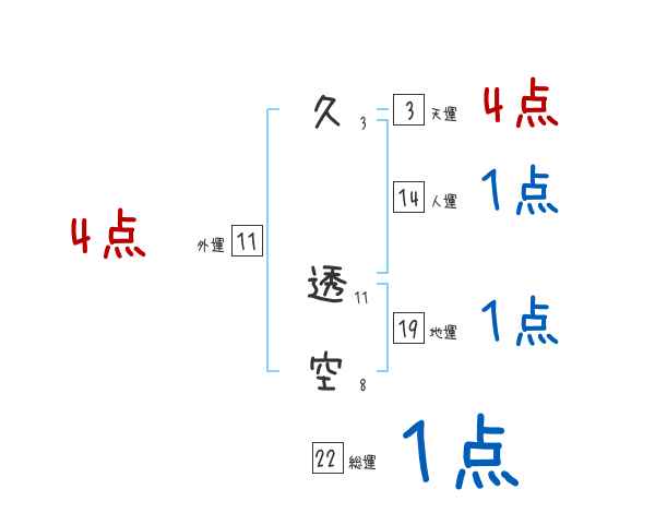 天運![]() | 久透空さんの天運は3画の4つ星!活動的で才能に恵まれ、多くの信頼を得る。希望に満ち成長する。 家系が持つ宿命的な運勢を表します。祖先から受け継いだ苗字ですので自分の力が及びません。家柄を象徴します。 |