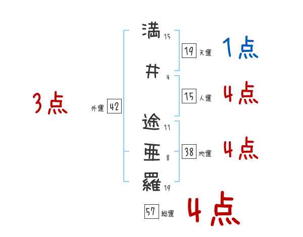 天運![]() | 満井途亜羅さんの天運は19画の1つ星!優れた才能を持ちますが、協調性が足りないことも。周りの人と協力する事を意識しましょう。 家系が持つ宿命的な運勢を表します。祖先から受け継いだ苗字ですので自分の力が及びません。家柄を象徴します。 |