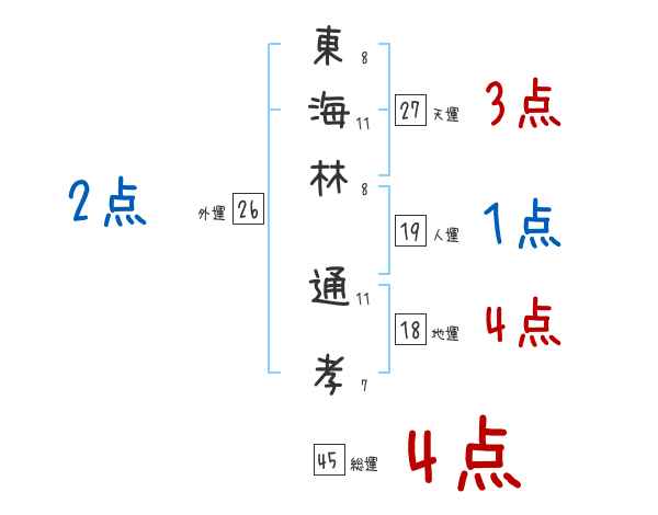 外運![]() | 東海林通孝さんの外運は26画の2つ星!波瀾万丈かも。信頼できる人を大事にしましょう。 生活面を象徴する運勢です。外部から受ける影響力を表し、結婚運、家庭運や職場、環境への順応性を表します。 |
