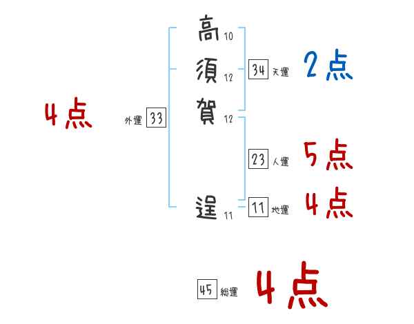 天運![]() | 高須賀逞さんの天運は34画の2つ星!独創性に優れるが、自尊心が強く災難に注意しましょう。 家系が持つ宿命的な運勢を表します。祖先から受け継いだ苗字ですので自分の力が及びません。家柄を象徴します。 |