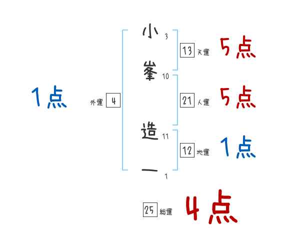 人運![]() | 小峯造一さんの人運は21画の5つ星!統率力がある。独立し成功する。名誉を手に入れる。 性格や才能などを表す2番目に重要な運勢です。人間関係や協調性、社会的な成功に影響します。主に20歳から50歳ぐらいまでの中年期の運勢を表します。 |
