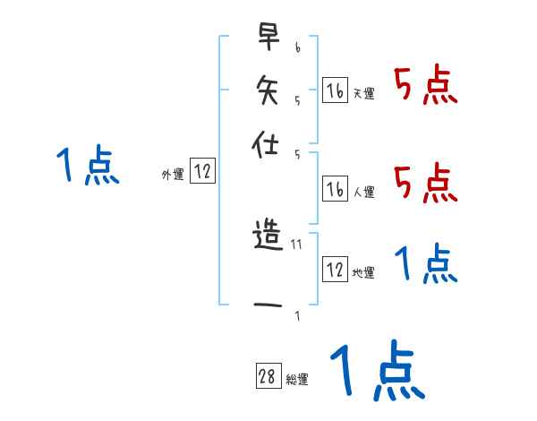 人運![]() | 早矢仕造一さんの人運は16画の5つ星!人望が厚く大きく発展する。逆転成功が見える。 性格や才能などを表す2番目に重要な運勢です。人間関係や協調性、社会的な成功に影響します。主に20歳から50歳ぐらいまでの中年期の運勢を表します。 |
