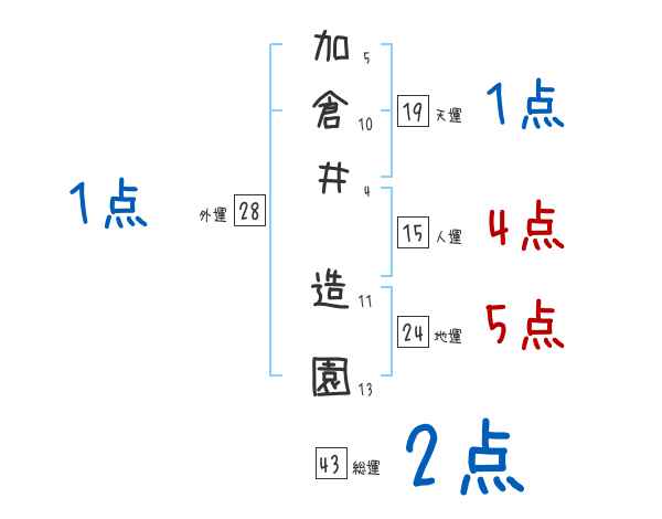 天運![]() | 加倉井造園さんの天運は19画の1つ星!優れた才能を持ちますが、協調性が足りないことも。周りの人と協力する事を意識しましょう。 家系が持つ宿命的な運勢を表します。祖先から受け継いだ苗字ですので自分の力が及びません。家柄を象徴します。 |