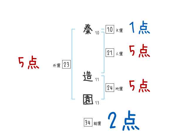 人運![]() | 秦造園さんの人運は21画の5つ星!統率力がある。独立し成功する。名誉を手に入れる。 性格や才能などを表す2番目に重要な運勢です。人間関係や協調性、社会的な成功に影響します。主に20歳から50歳ぐらいまでの中年期の運勢を表します。 |